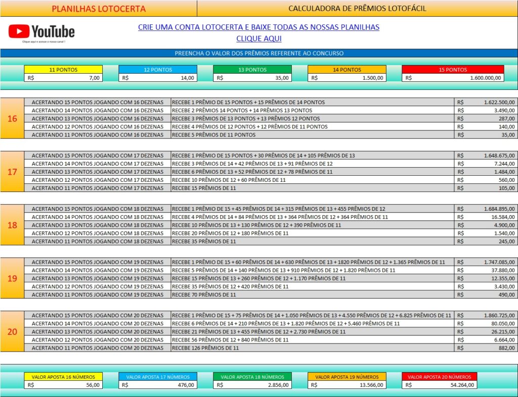 A calculadora que disponibilizo abaixo é feita em Excel e temos a versão gratuita e a Versão Premium, na versão premium basta preencher os campos com os valores dos prêmios convencionais e ela irá calcular todas as possibilidades quando se joga com mais de 15 dezenas.